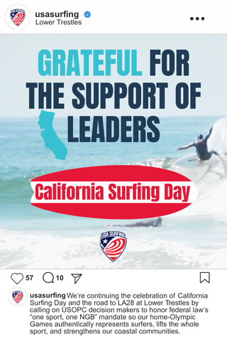 We’re continuing the celebration of California Surfing Day and the road to LA28 at Lower Trestles by calling on USOPC decision makers to honor federal law’s “one sport, one NGB” mandate so our home-Olympic Games authentically represents surfers, lifts the whole sport, and strengthens our coastal communities.
